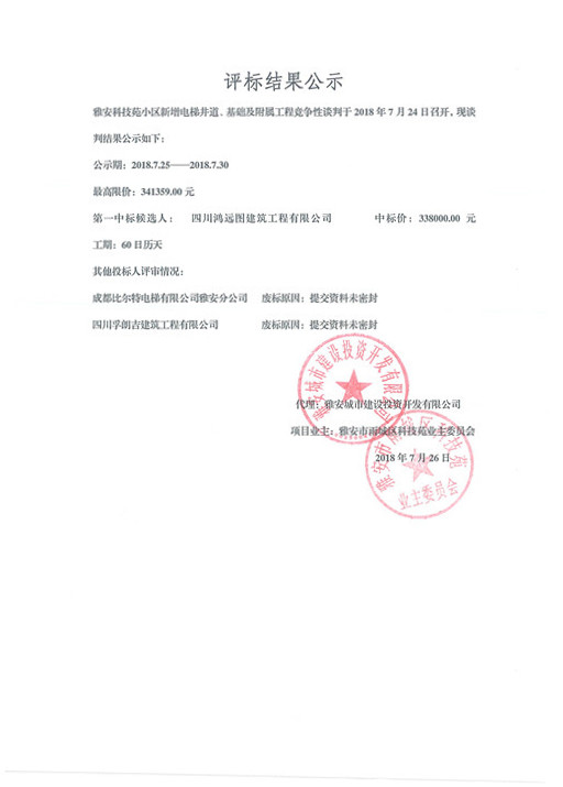 關(guān)于雅安科技苑小區(qū)新增電梯井道、基礎(chǔ)及附屬工程競爭性談判的結(jié)果公示