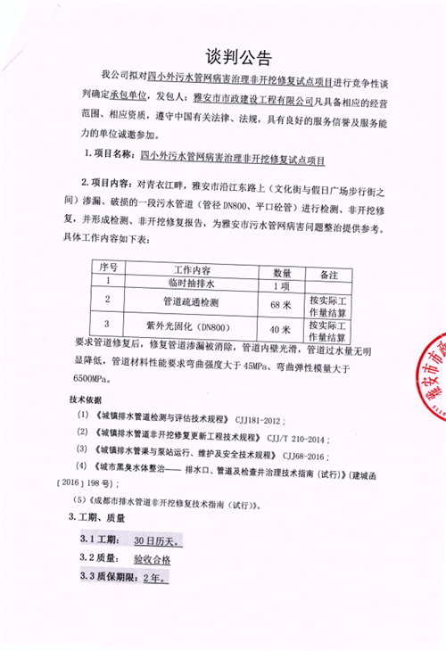 四小外污水管網(wǎng)病害治理非開(kāi)挖修復(fù)試點(diǎn)項(xiàng)目競(jìng)爭(zhēng)性談判公告(市政公司)