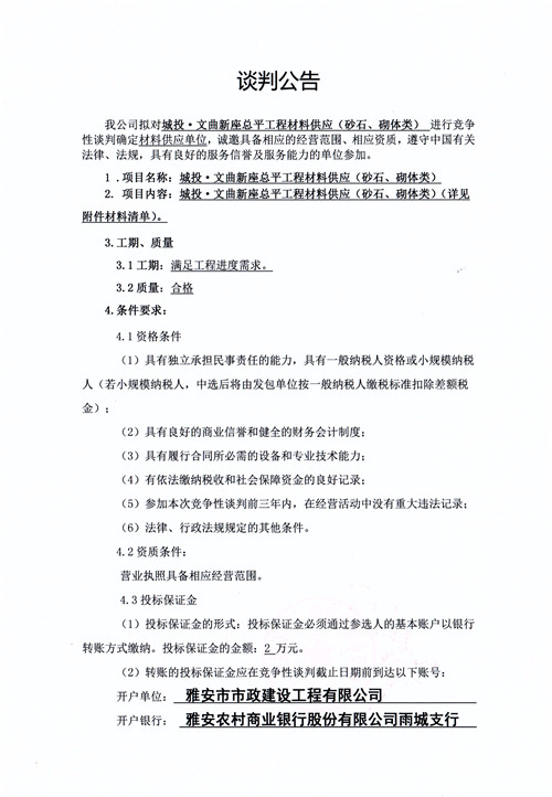 市政公司城投·文曲新座總平工程材料供應(yīng)(砂石、砌體類)競爭性談判公告