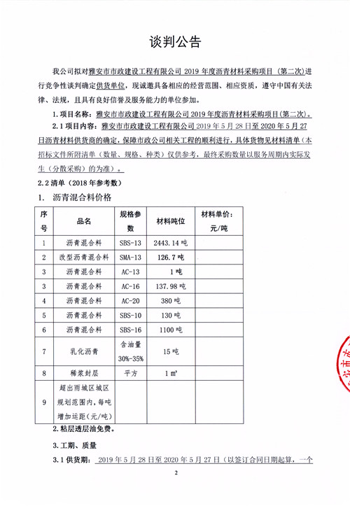 市政公司2019年度瀝青材料采購項(xiàng)目競爭性談判公告 (第二次)