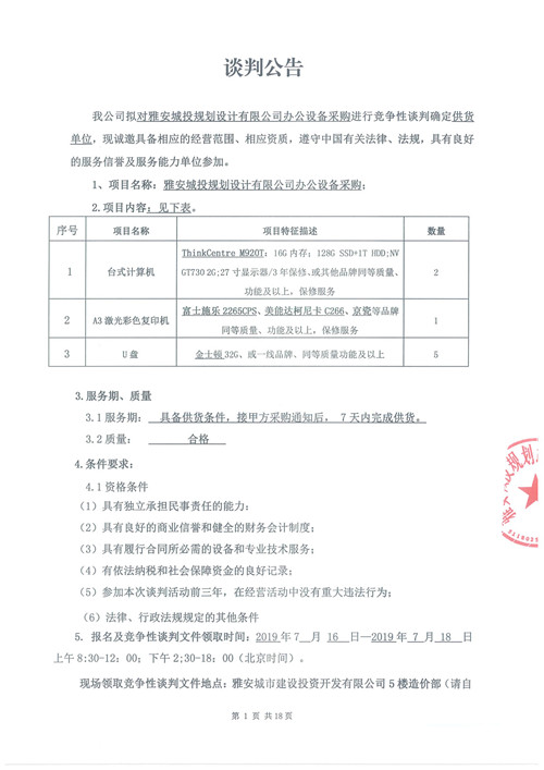 雅安城投規(guī)劃設(shè)計(jì)有限公司辦公設(shè)備采購(gòu)競(jìng)爭(zhēng)性談判公告