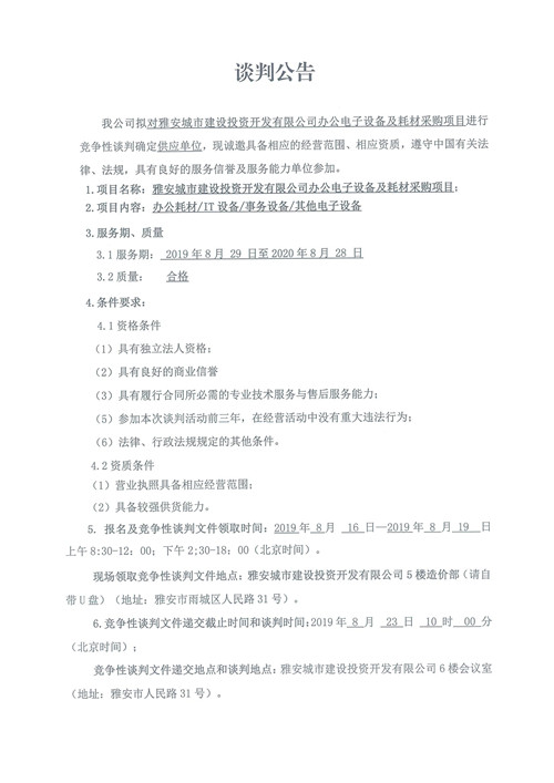 雅安城市建設(shè)投資開發(fā)有限公司辦公電子設(shè)備及耗材采購項(xiàng)目競爭性談判公告