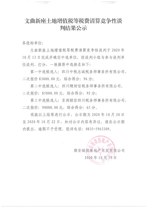 文曲新座土地增值稅等稅費(fèi)清算競爭性談判結(jié)果公示