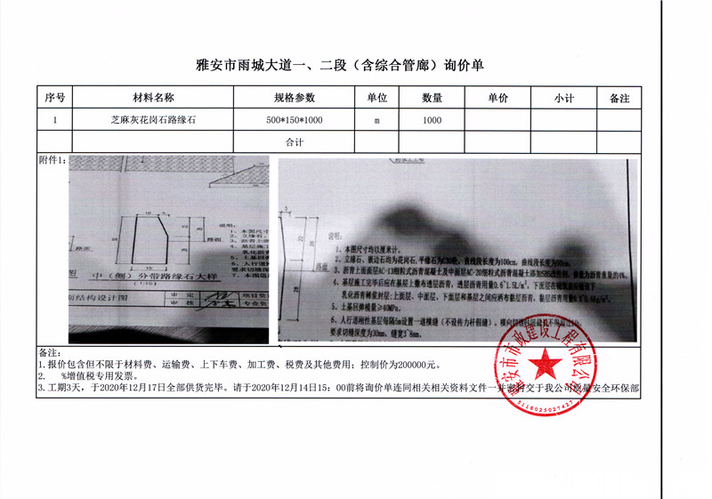 雅安市雨城大道一、二段(含綜合管廊)花崗石路緣石詢價(jià)單