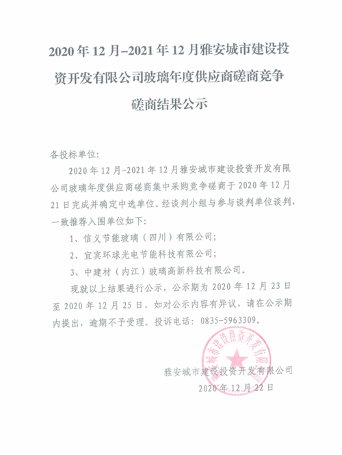 2020年12月-2021年12月雅安城市建設(shè)投資開(kāi)發(fā)有限公司玻璃年度供應(yīng)商磋商競(jìng)爭(zhēng)磋商結(jié)果公示