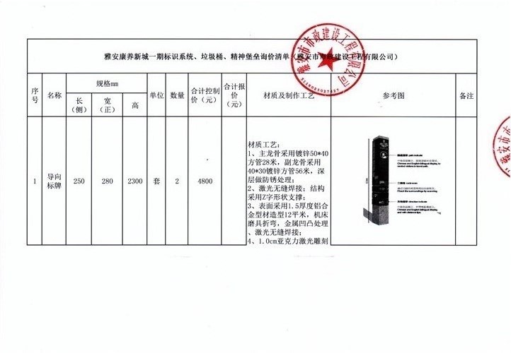 雅安康養(yǎng)新城一期標(biāo)識系統(tǒng)、垃圾桶、精神堡壘詢價清單(雅安市市政建設(shè)工程有限公司)