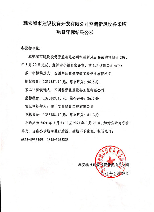 城投公司空調(diào)新風(fēng)設(shè)備采購(gòu)項(xiàng)目評(píng)標(biāo)結(jié)果公示