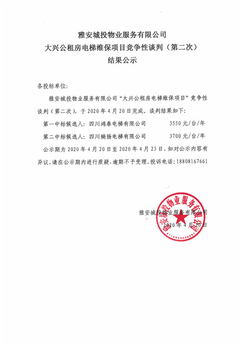 城投物業(yè)公司大興公租房電梯維保項目競爭性談判(第二次)結果公示