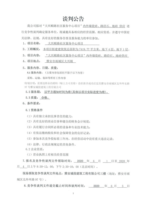 城投建工公司“大興順路社區(qū)服務(wù)中心項(xiàng)目”內(nèi)外墻瓷磚、路沿石、地磚供應(yīng)競(jìng)爭(zhēng)性談判公告