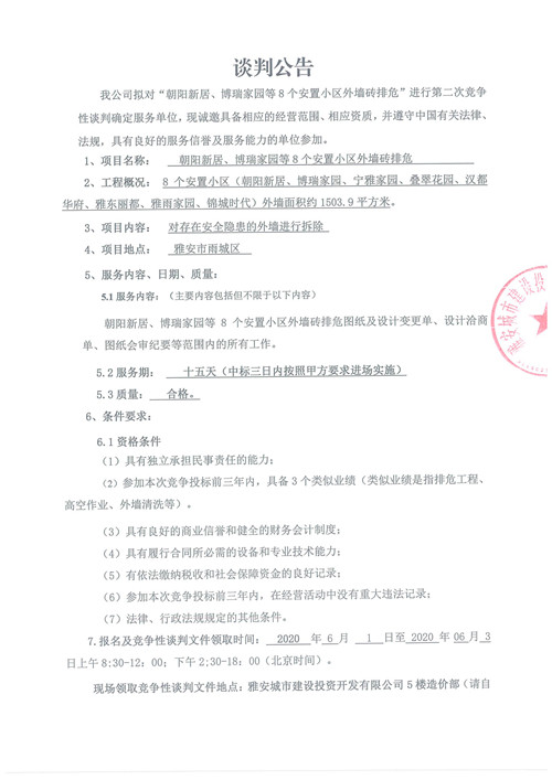 城投公司“朝陽新居、博瑞家園等8個(gè)安置小區(qū)外墻磚排危”競爭性談判公告(第二次)