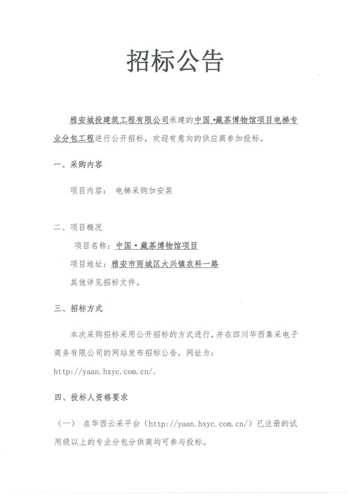城投建工公司中國(guó)·藏茶博物館項(xiàng)目電梯專業(yè)分包工程招標(biāo)公告