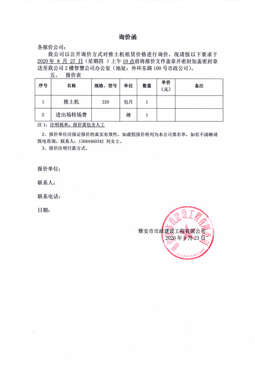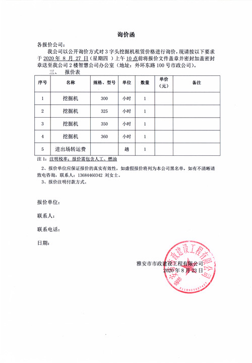 雅安市市政建設(shè)工程有限公司挖掘機(jī)租賃詢價函