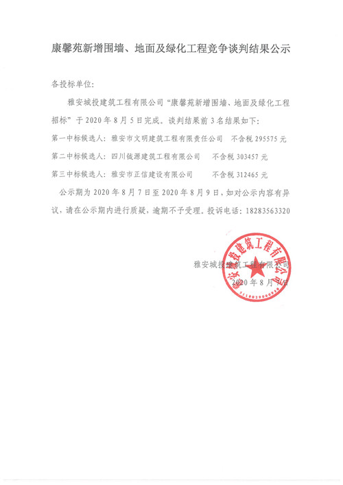 城投建工公司康馨苑新增圍墻、地面及綠化工程競(jìng)爭(zhēng)性談判結(jié)果公示