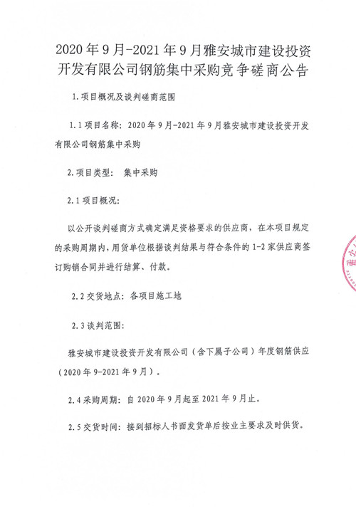 2020年9月-2021年9月雅安城市建設投資開發(fā)有限公司鋼筋集中采購競爭磋商公告