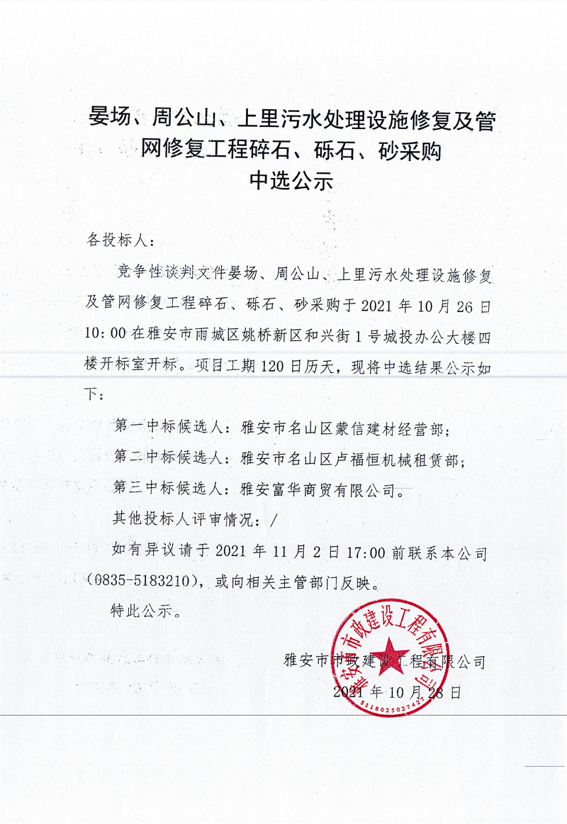 晏場(chǎng)、周公山、上里污水處理設(shè)施修復(fù)及管網(wǎng)修復(fù)工程碎石、礫石、砂采購中選公示