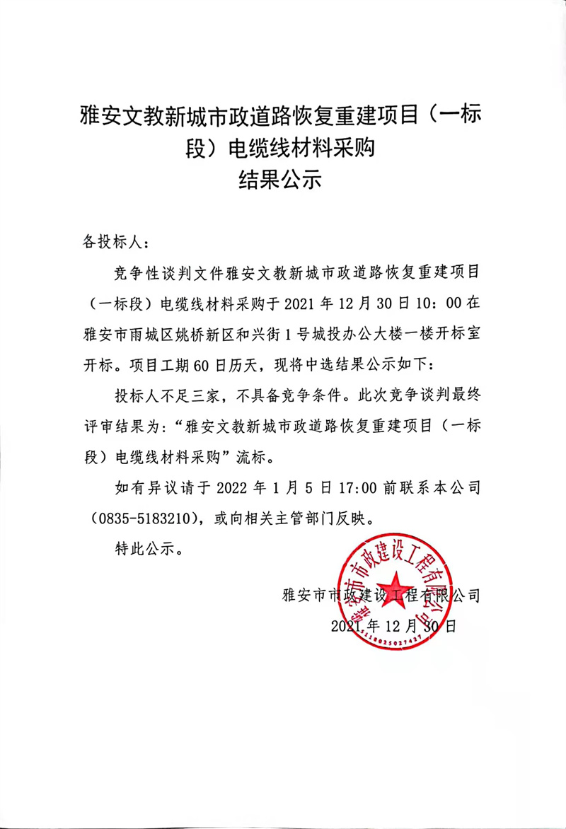 雅安文教新城市政道路恢復(fù)重建項(xiàng)目(一標(biāo)段)電纜線材料采購(gòu)競(jìng)爭(zhēng)性談判公告