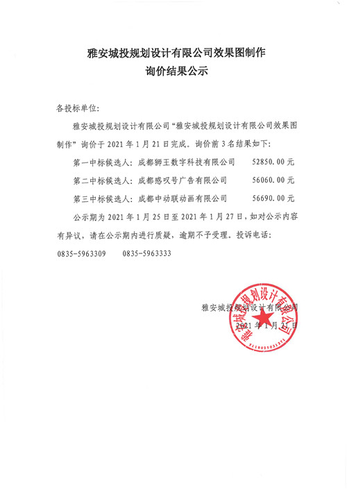雅安城投規(guī)劃設計有限公司效果圖制作詢價結(jié)果公示