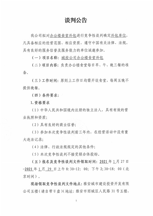 雅安城市建設(shè)投資開發(fā)有限公司辦公樓食堂外包競(jìng)爭(zhēng)性談判公告