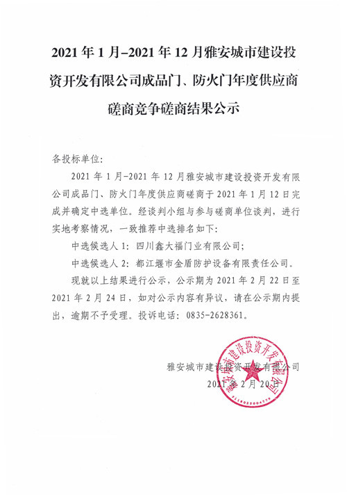 2021年1月-2021年12月雅安城市建設(shè)投資開(kāi)發(fā)有限公司成品門(mén)、防火門(mén)年度供應(yīng)商磋商競(jìng)爭(zhēng)磋商結(jié)果公示
