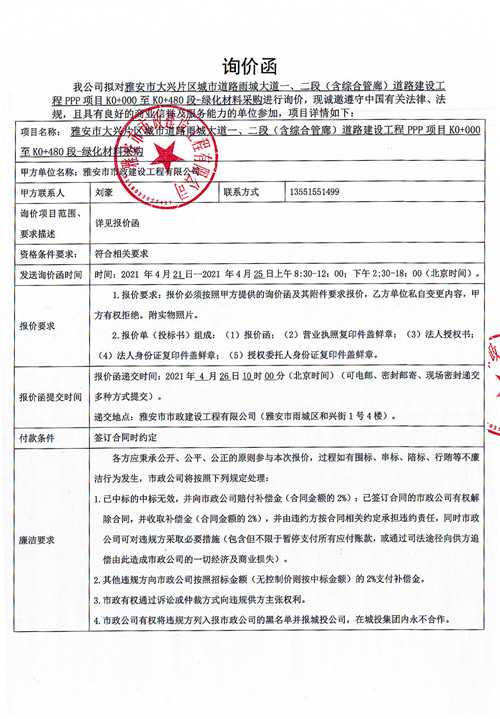 雅安市大興片區(qū)城市道路雨城大道一、二段(含綜合管廊)道路建設(shè)工程PPP項(xiàng)目K0+000至K0+480段-綠化材料采購詢價函
