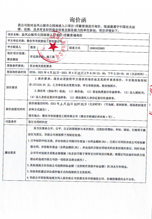 金鳳山城市公園南坡入口項目-浮雕景墻詢價函