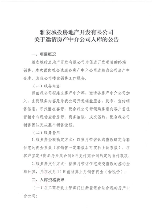 雅安城投房地產(chǎn)開發(fā)有限公司關(guān)于邀請房地產(chǎn)中介公司入庫的公告
