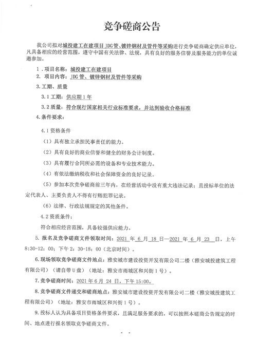 城投建工公司在建項(xiàng)目JDG管、鍍鋅鋼材及管件等采購競爭性磋商公告
