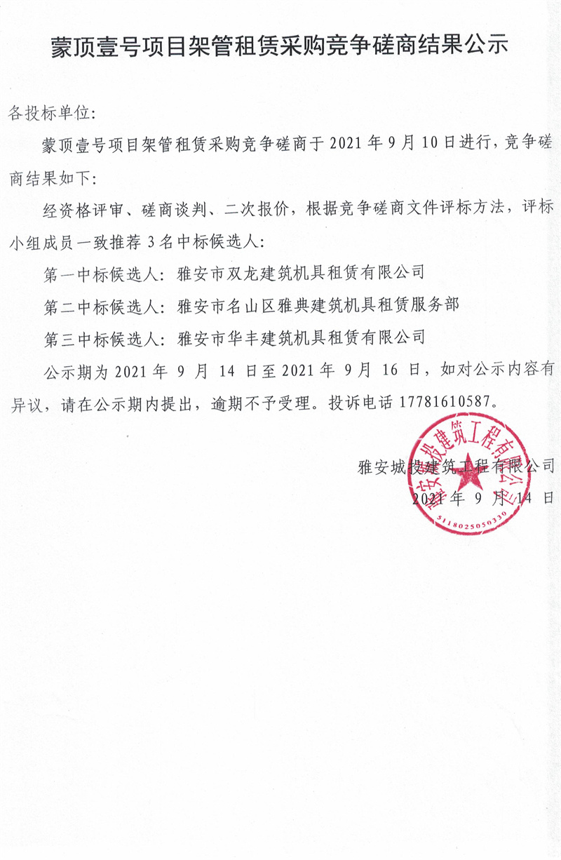 蒙頂壹號(hào)項(xiàng)目架管租賃采購競(jìng)爭(zhēng)磋商結(jié)果公示