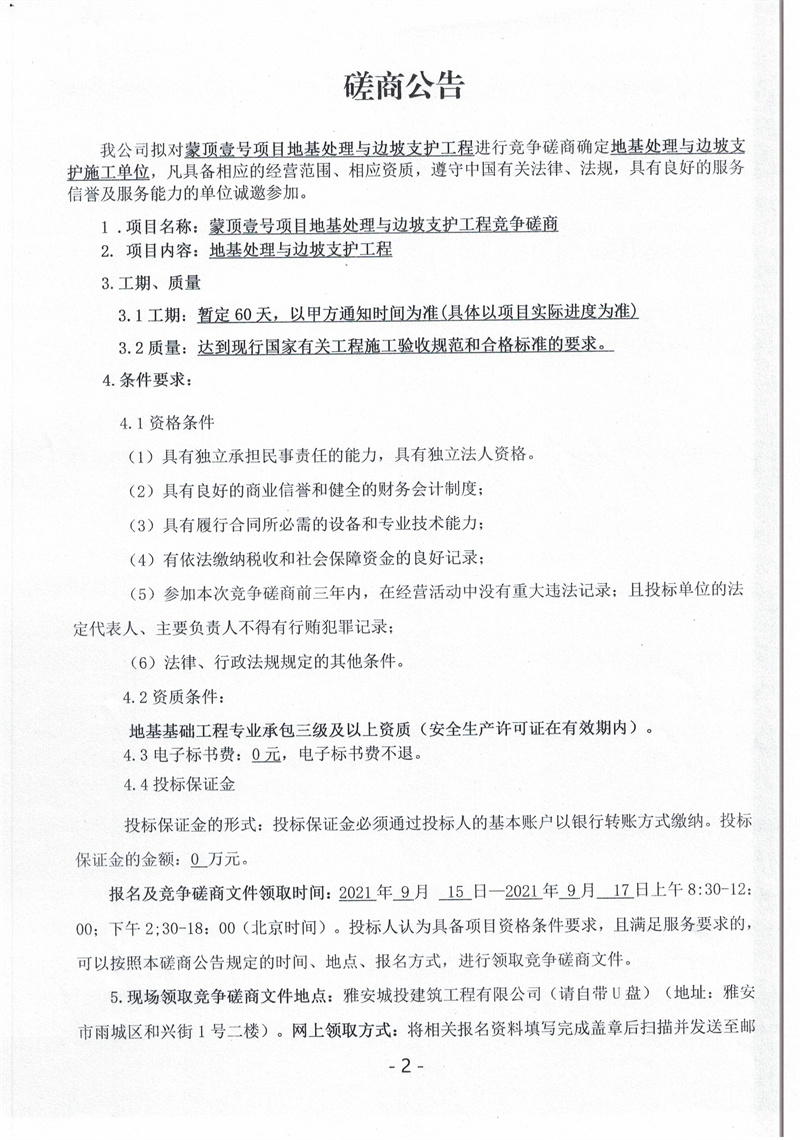 蒙頂壹號(hào)項(xiàng)目地基處理與邊坡支護(hù)工程競爭磋商公告