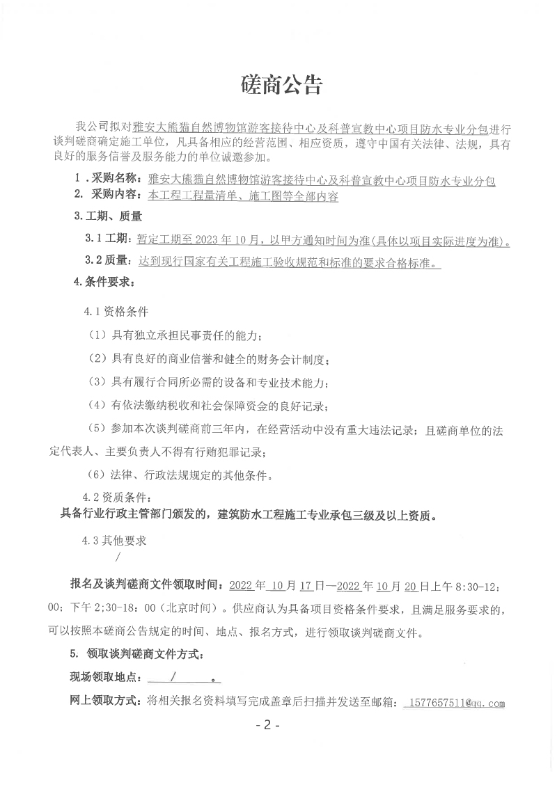 雅安大熊貓自然博物館游客接待中心及科普宣教中心項目防水專業(yè)分包談判磋商公告
