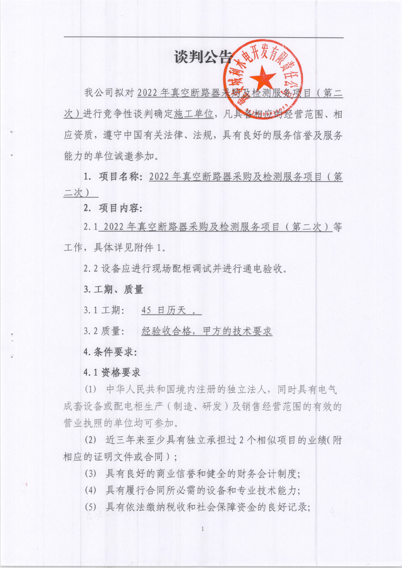 城利水電公司2022年真空斷路器采購及檢測服務(wù)項(xiàng)目(第二次)競爭性談判