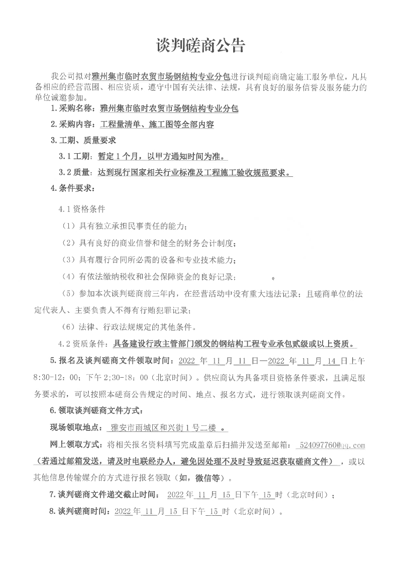 雅州集市臨時(shí)農(nóng)貿(mào)市場(chǎng)鋼結(jié)構(gòu)專(zhuān)業(yè)分包談判磋商公告