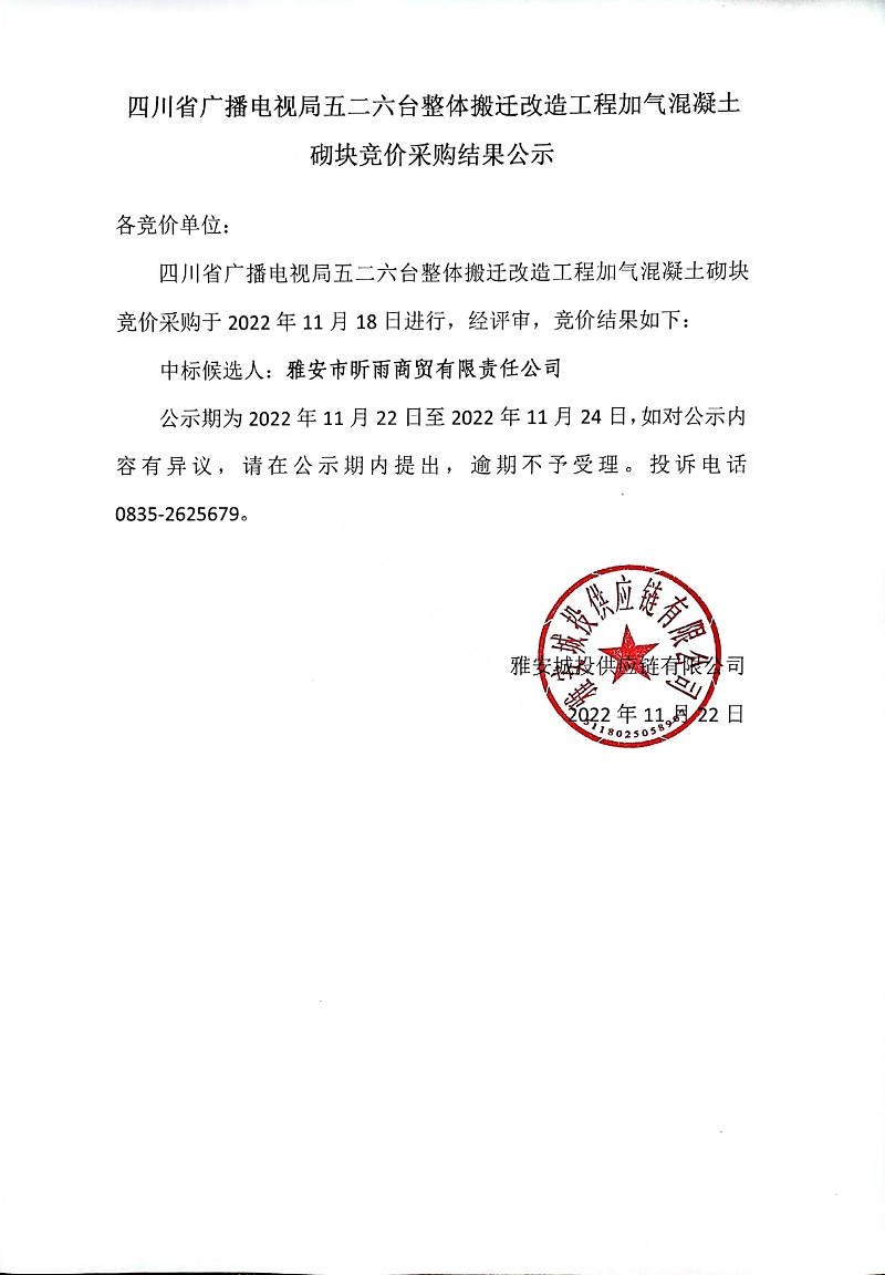 四川省廣播電視局五二六臺整體搬遷改造工程加氣混凝土砌塊競價(jià)采購結(jié)果公示