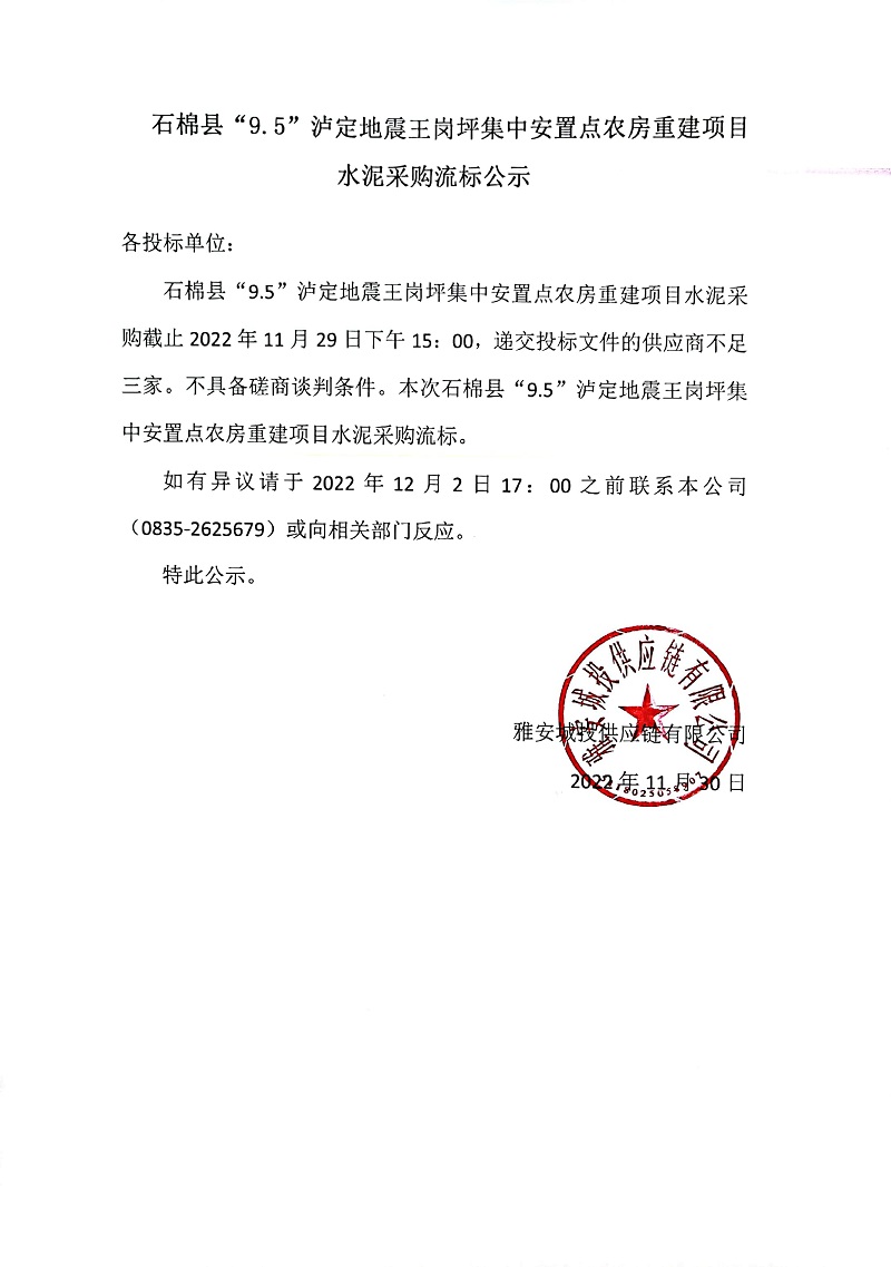 石棉縣“9.5”瀘定地震王崗坪集中安置點農(nóng)房重建項目水泥采購流標(biāo)公示