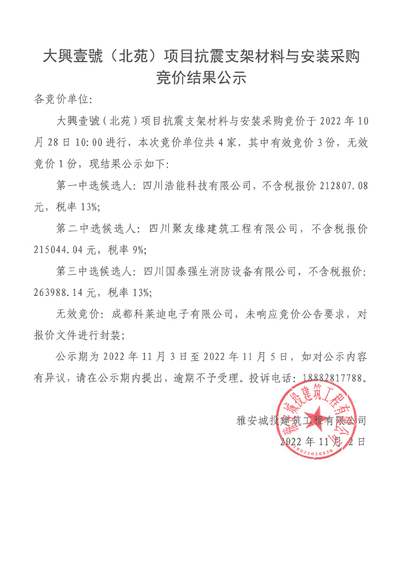 大興壹號(北苑)項目抗震支架材料與安裝采購競價結果公示