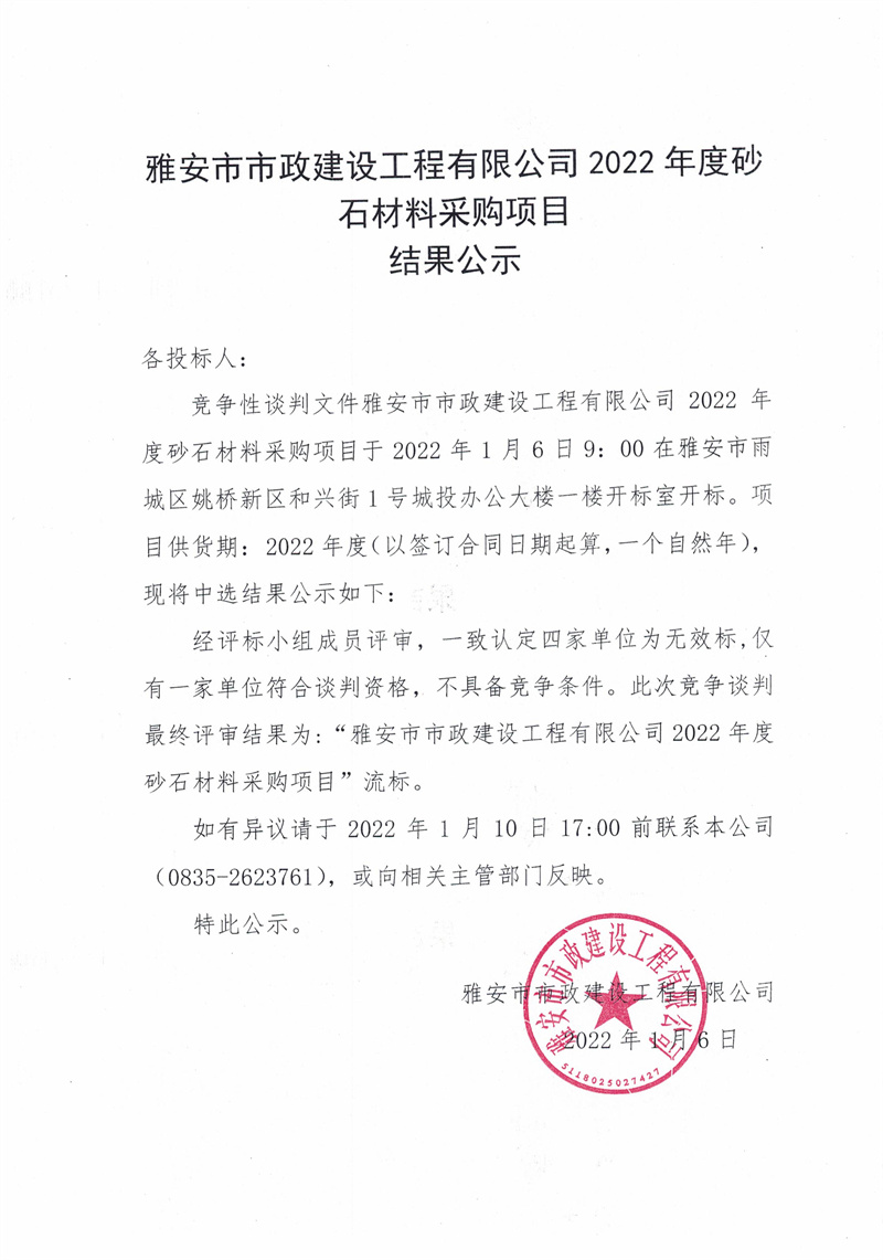 雅安市市政建設工程有限公司2022年度砂石材料采購項目結果公示