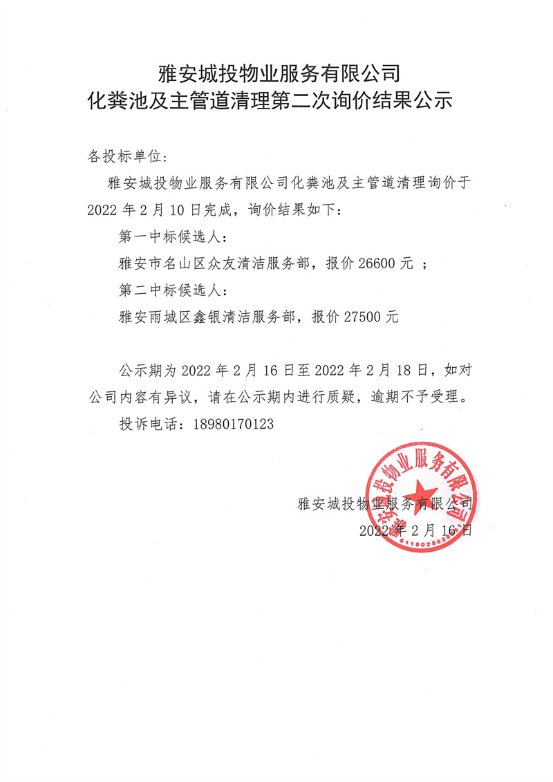 雅安城投物業(yè)服務有限公司化糞池及主管道清理詢價結(jié)果公示