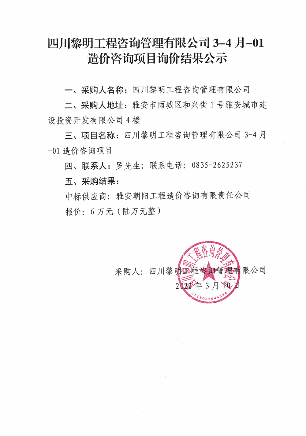 四川黎明工程咨詢管理有限公司3-4月-01造價咨詢項目詢價結(jié)果公示