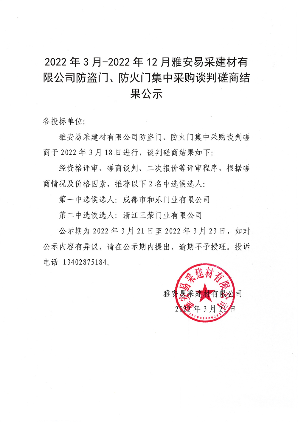 2022年3月-2022年12月雅安易采建材有限公司防盜門、防火門等談判磋商結(jié)果公示