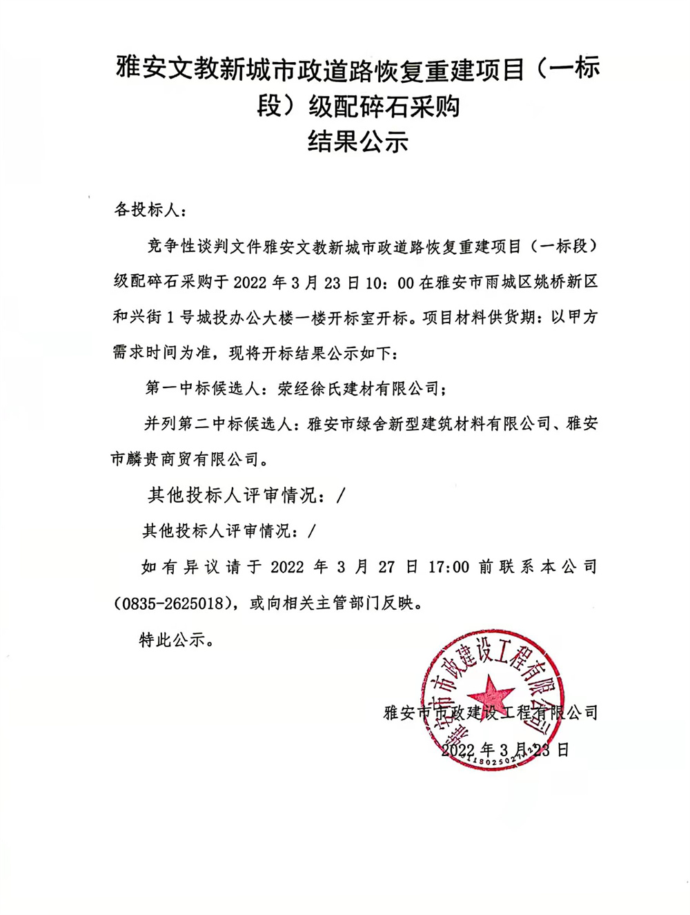 雅安文教新城市政道路恢復(fù)重建項(xiàng)目(一標(biāo)段)級(jí)配碎石采購結(jié)果公示