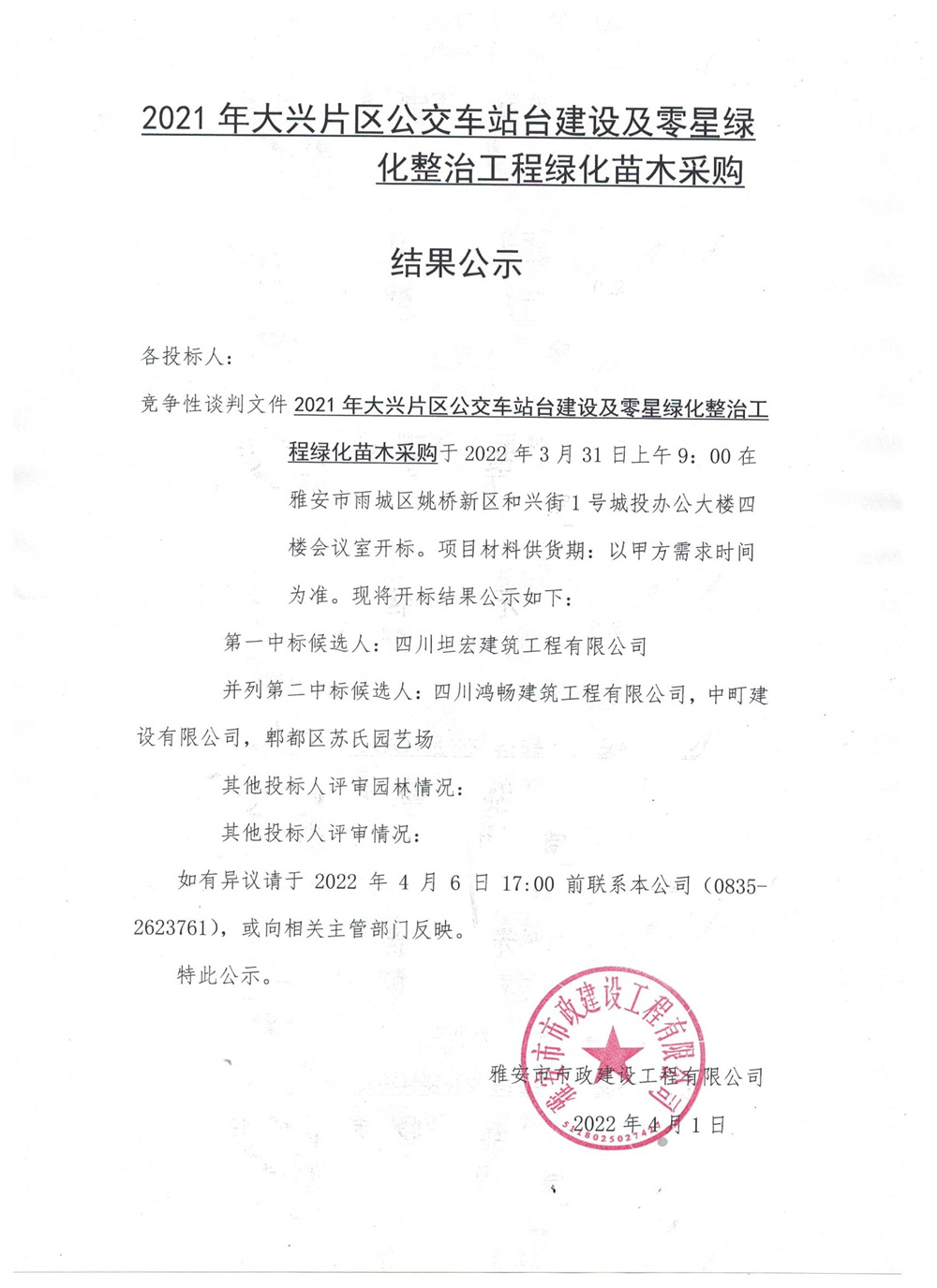 2021年大興片區(qū)公交站臺(tái)建設(shè)及零星綠地整治工程綠化苗木采購(gòu)結(jié)果公示