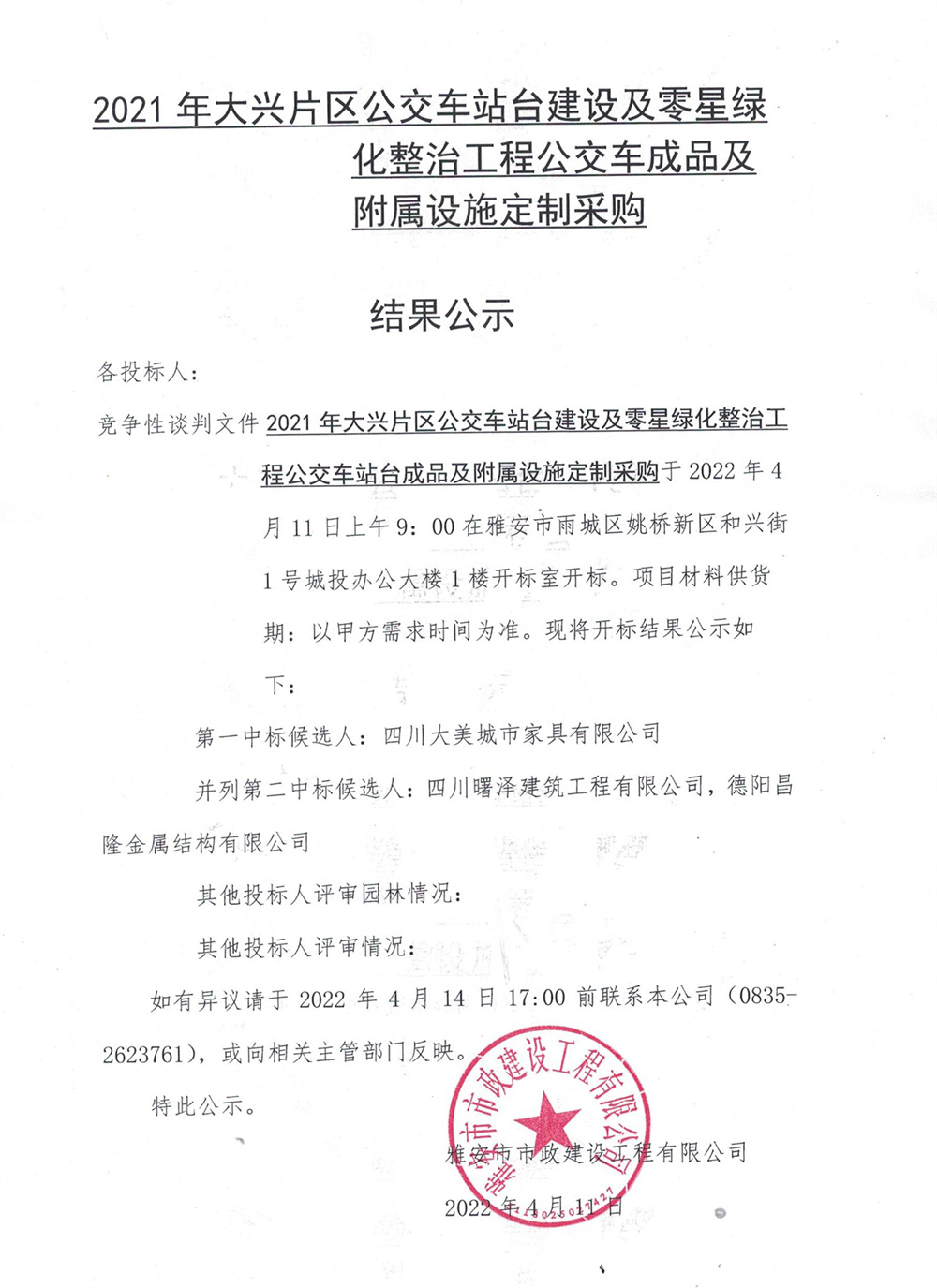 2021年大興片區(qū)公交站臺(tái)建設(shè)及零星綠地整治工程公交站臺(tái)成品及附屬設(shè)施定制采購結(jié)果公示