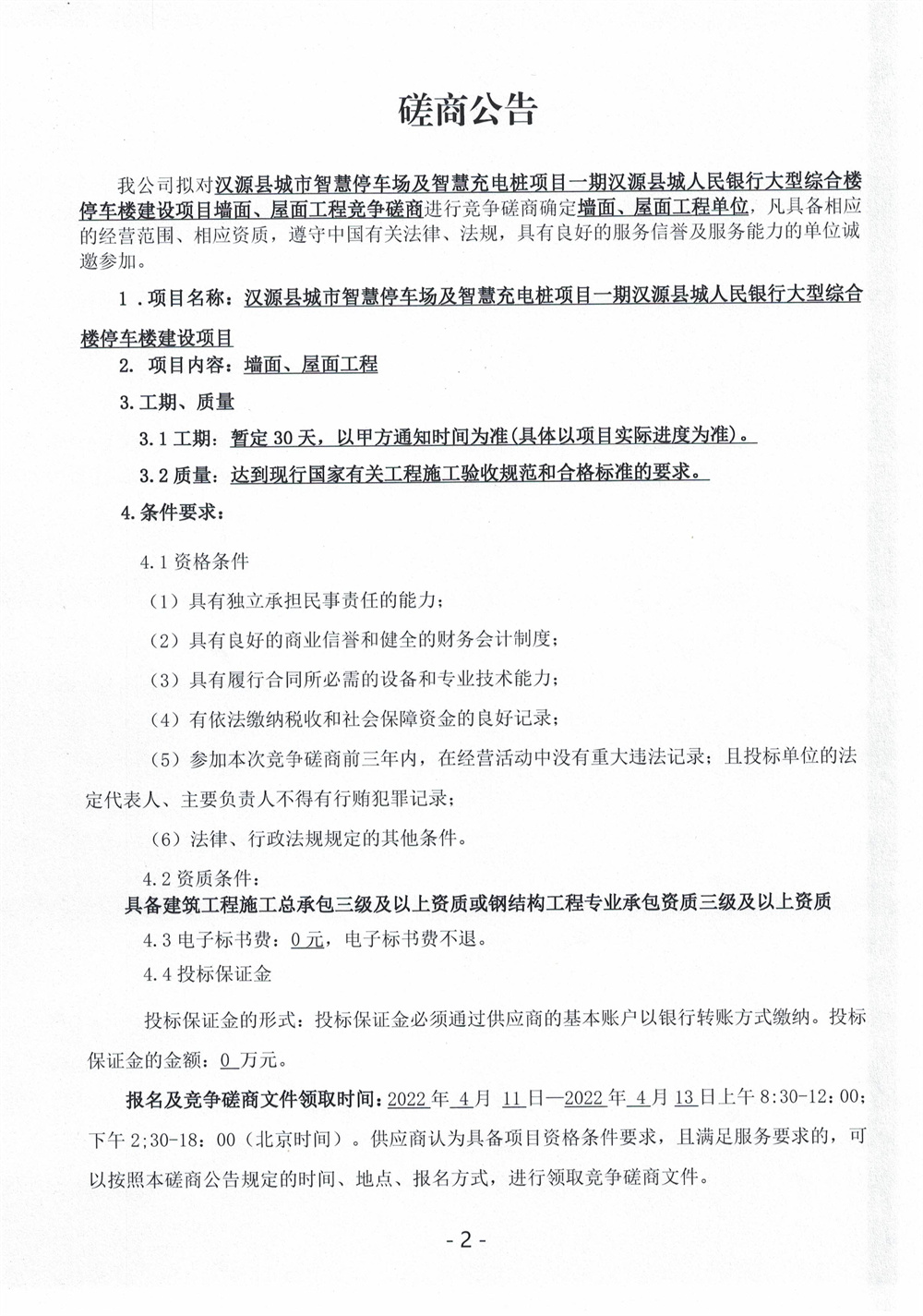 城投建工漢源縣城市智慧停車場及智慧充電樁項目一期漢源縣城人民銀行大型綜合樓停車樓建設(shè)項目墻面、屋面工程競爭磋商公告