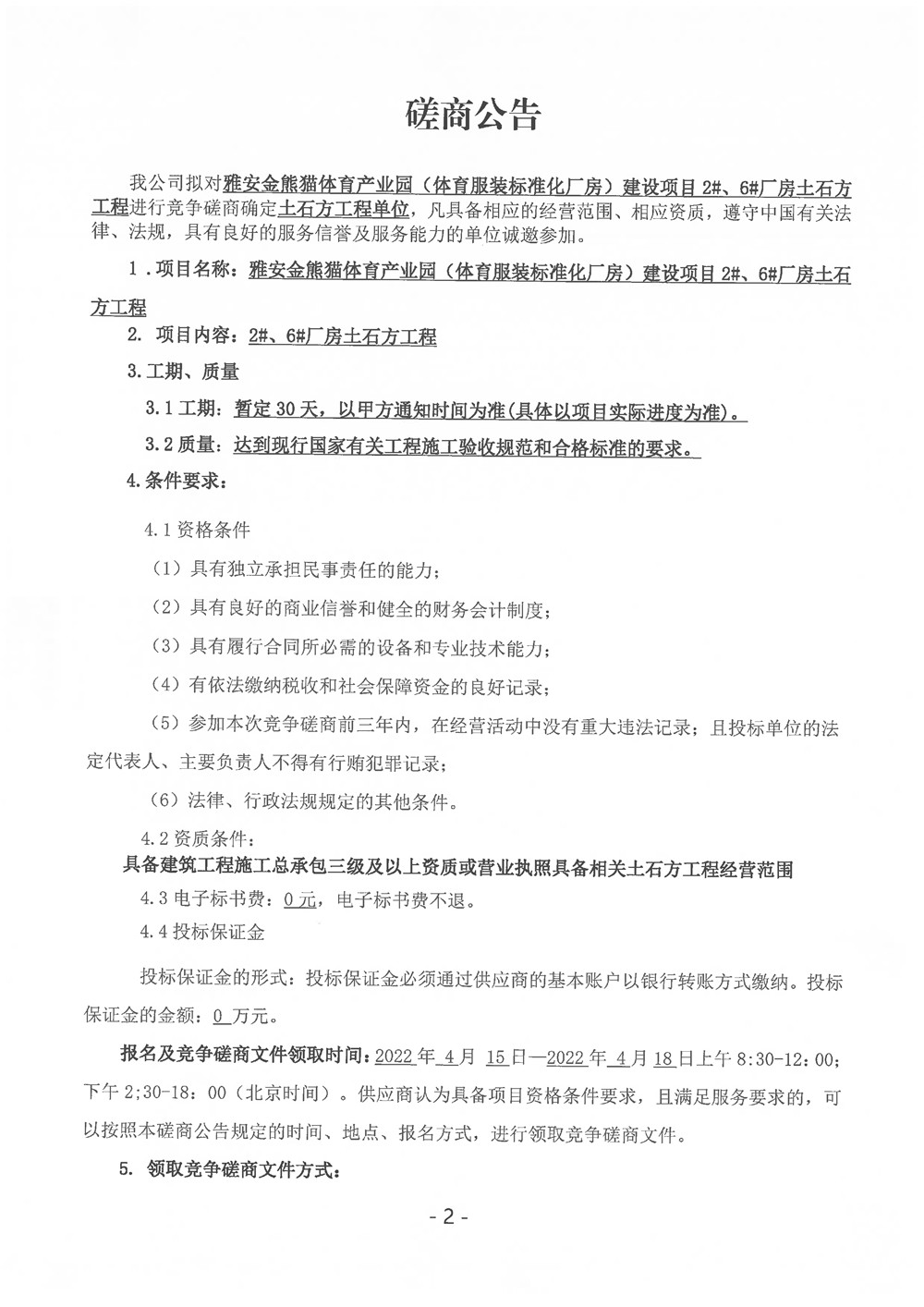 雅安金熊貓?bào)w育產(chǎn)業(yè)園(體育服裝標(biāo)準(zhǔn)化廠房)建設(shè)項(xiàng)目2#、6#廠房土石方工程磋商公告