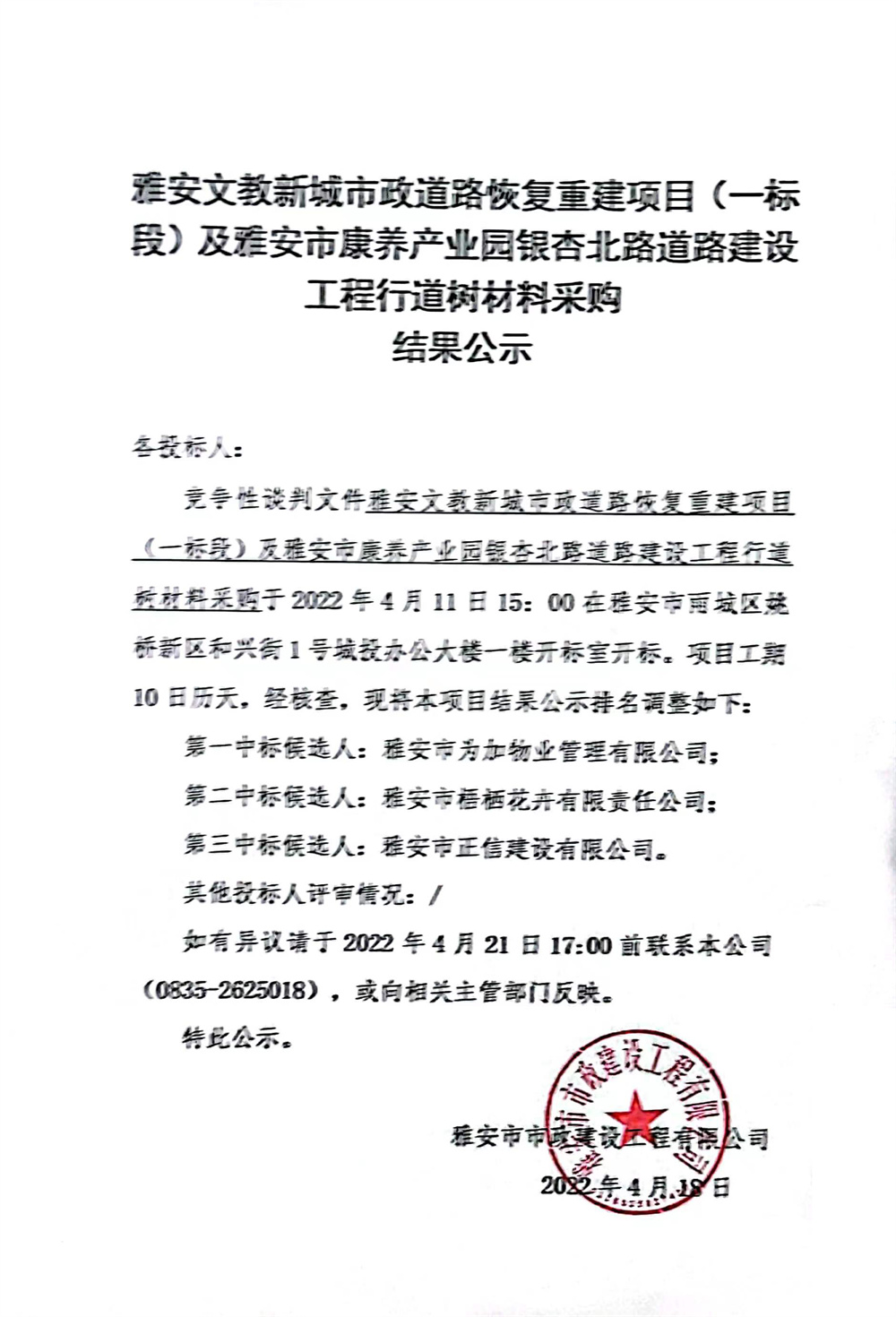 雅安文教新城市政道路恢復(fù)重建項(xiàng)目(一標(biāo)段)及雅安市康養(yǎng)產(chǎn)業(yè)園銀杏北路道路建設(shè)工程行道樹材料采購結(jié)果公示