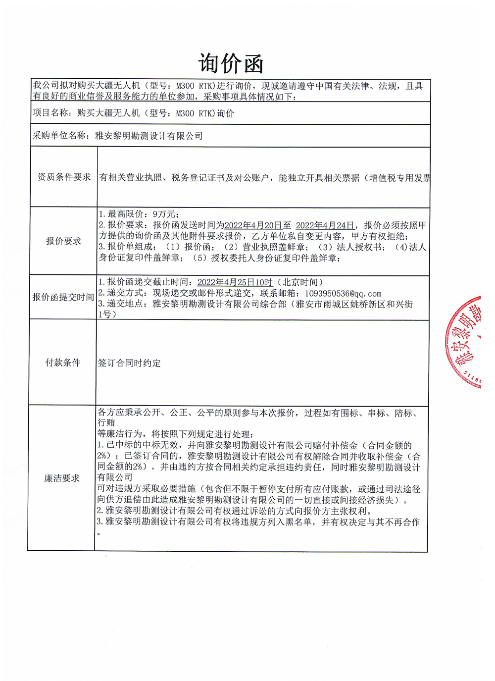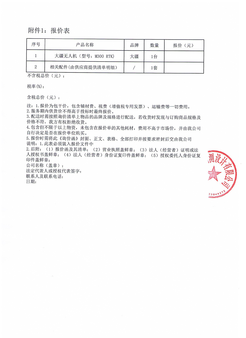 黎明勘測(cè)公司購(gòu)買大疆無(wú)人機(jī)(型號(hào):M300 RTK)詢價(jià)函