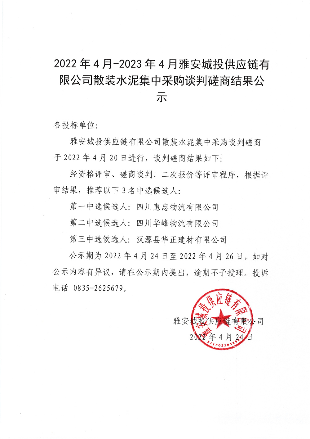 2022年4月-2023年4月雅安城投供應(yīng)鏈有限公司散裝水泥采購談判磋商結(jié)果公示