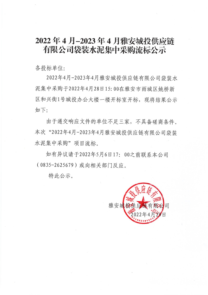 2022年4月-2023年4月雅安城投供應(yīng)鏈有限公司袋裝水泥集中采購流標(biāo)公示