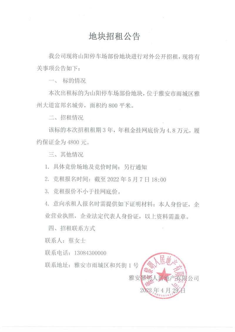 黎明人居公司山陽(yáng)停車場(chǎng)部分地塊招租公告