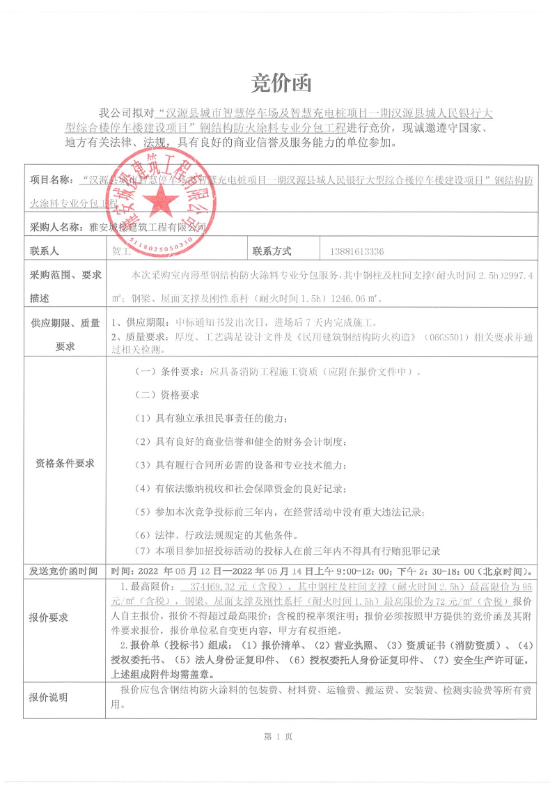 漢源縣城市智慧停車場及智慧充電樁項(xiàng)目一期漢源縣城人民銀行大型綜合樓停車樓建設(shè)項(xiàng)目防火涂料專業(yè)分包競價(jià)采購公告